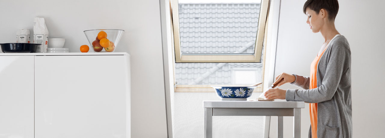 Have all your meals with your family – without any uninvited guests, even with the windows open with a VELUX insect screen. And whenever the screen is not needed, simply roll it up in the aluminum casing. It can be combined with all types of VELUX shades.