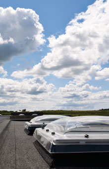 L'unité à vitrage double est munie d'une vitre intérieure laminée qui procure une sécurité additionnelle. Le dôme transparent ou opaque en polycarbonate est conçu pour protéger l'unité à double vitrage de la pluie et de la neige.